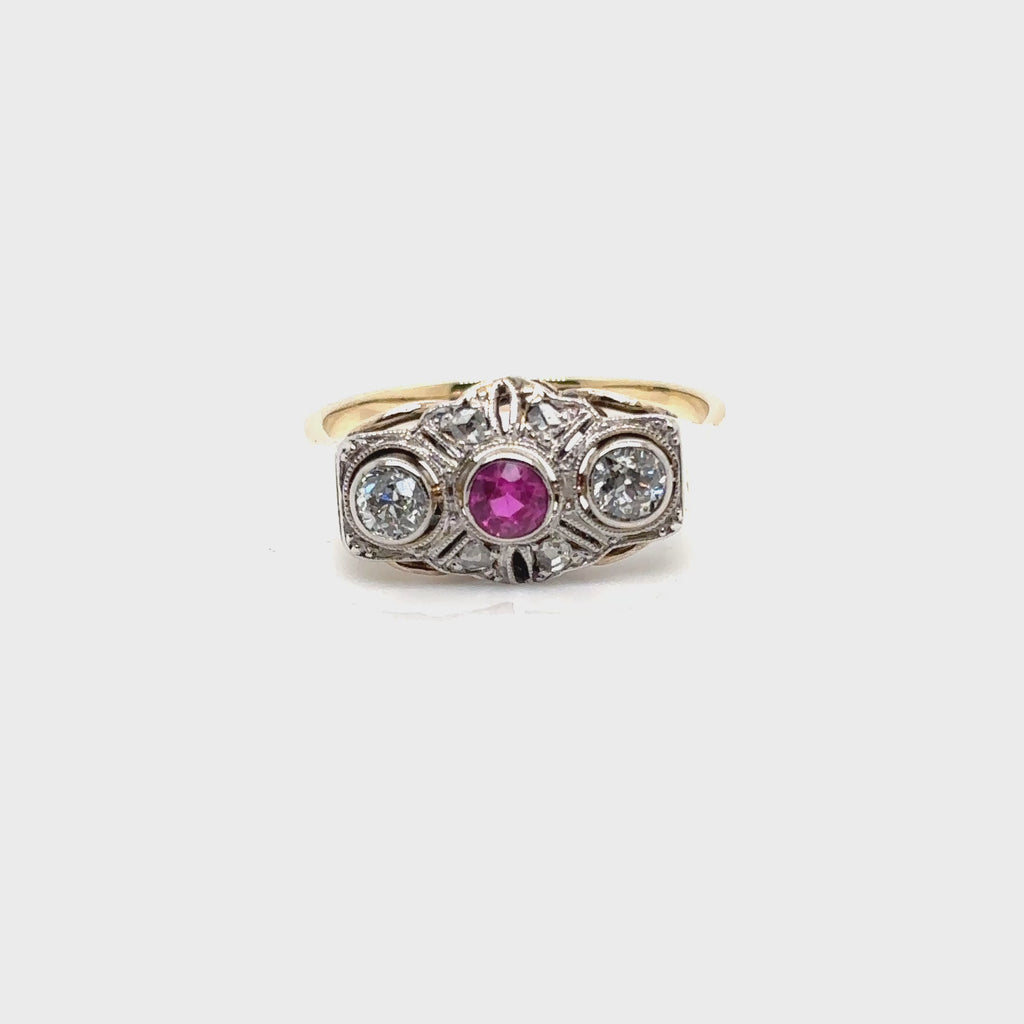 Ring aus 585 Gelbgold und Weissgold besetzt mit Altschliff Diamanten und rotem Farbstein Antik